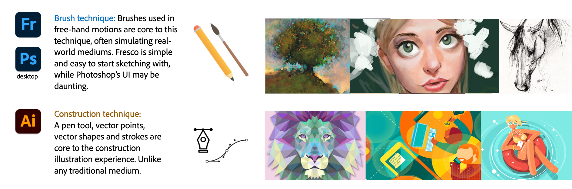 - Bespoke Drawing & Painting positioning for each hero portfolio application’s audience – Photoshop, Illustrator, and Adobe Fresco