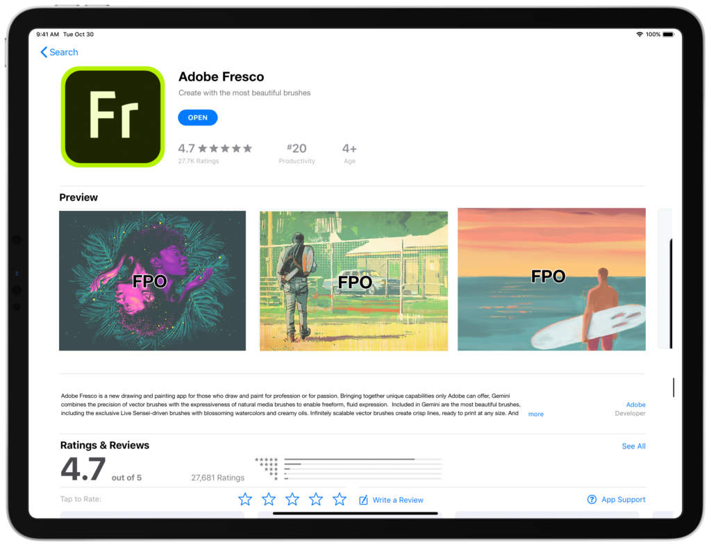 - Built Adobe Fresco micro-site to serve as marketing hub, with downloadable templates, remixable assets, and detailed tutorials for influencers, and Apple Store Employees